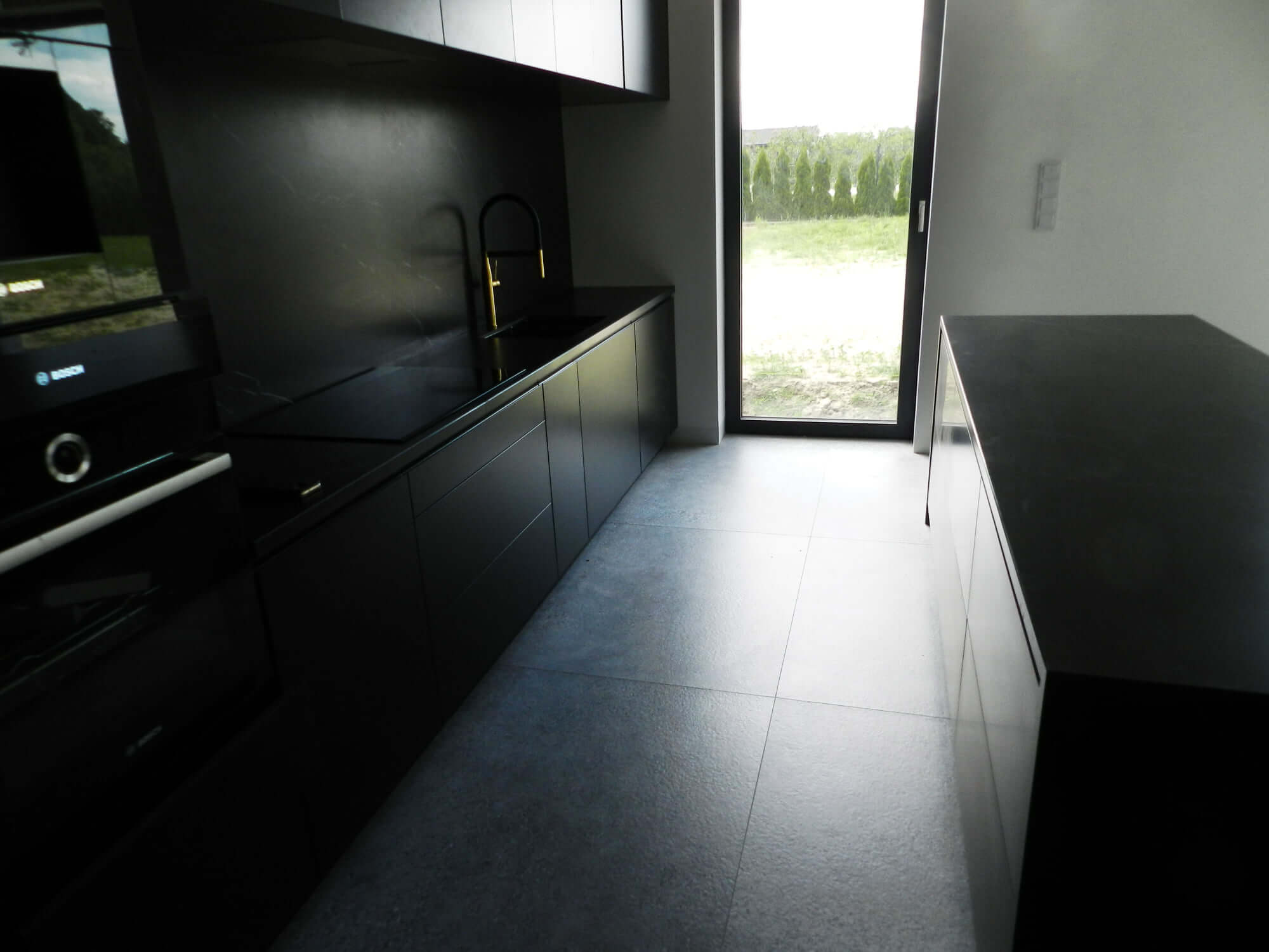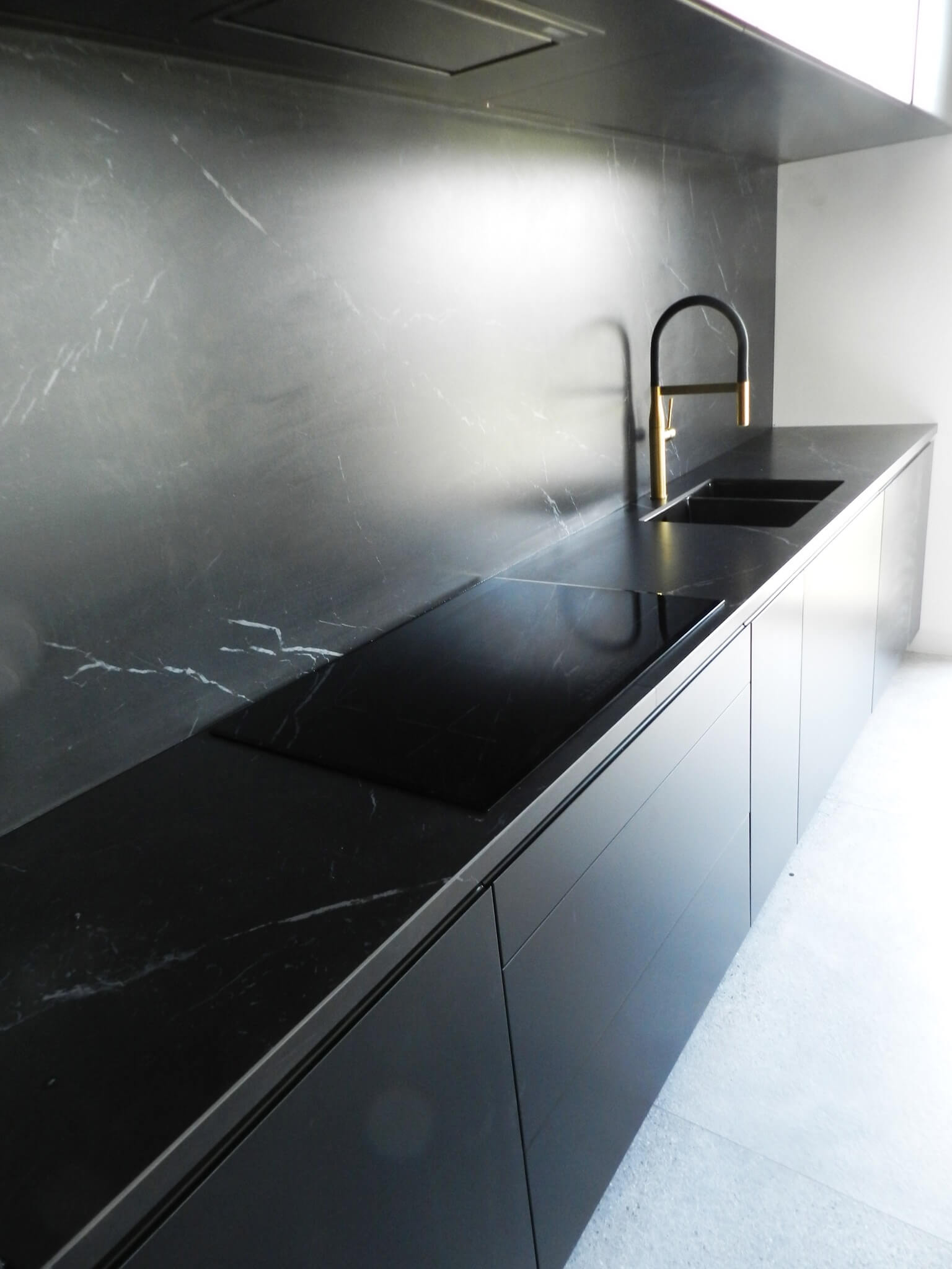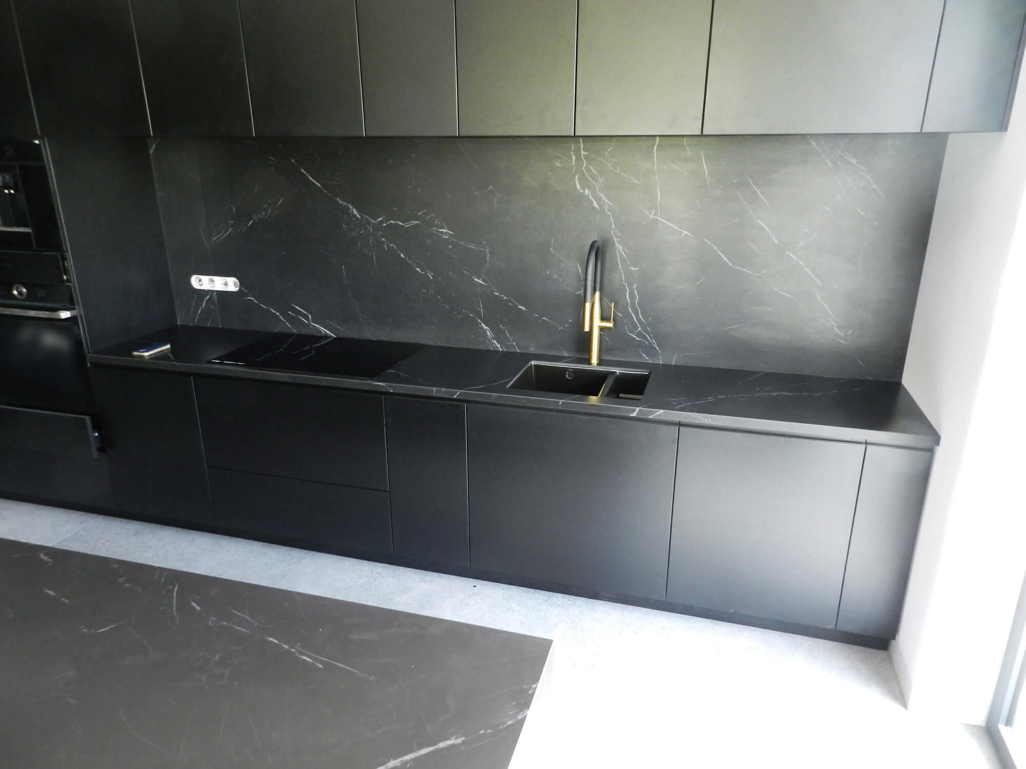 W dzisiejszej realizacji jest to minimalistyczna kuchnia, w której spiek Marquina znalazł się na blacie kuchennym oraz ścianie. Doskonale współgra z matową, czarną, zabudową oraz złotymi akcentami, dzięki którym taka aranżacja nabiera jeszcze większej klasy.